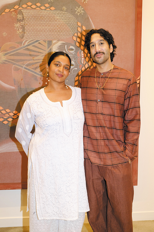 ARTIST RAJNI PERERA (left) and gallery owner Rajiv Menon in front of painting “Dark Matter,” 2025. Courtesy of the artist and Rajiv Menon Contemporary.