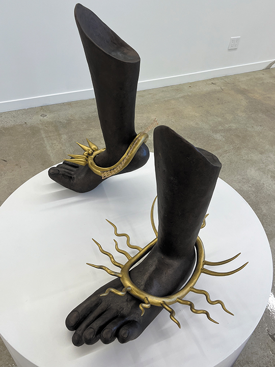 The current exhibit, “Dhum Lokaya (Smoke World),” on view through Sat., Dec. 13, features Toronto-based, Sri Lankan-born artist Rajni Perera. Powerful sculptures and luminous canvases of paint and beading on translucent polyester explore the dichotomy of feminine fragility and forcefulness with images culled from science fiction and ancient mythology. The site-specific sculpture “Swampgirly” is a fierce swamp monster that seemingly breaks through the surface of the gallery’s polished concrete floor, symbolic of women’s hidden rage. The painting “Primitive,” of a crouching naked woman covered in flies, her head a mass of flowers and fruit, shows the powerful mix of sweet blooms and sickly decay that hits one in the face in tropical climates. Perera’s painting of a figure with the skin of the prickly, stinky, soft-fleshed durian fruit, common in Asian countries, suggests this woman as an outsider whose layer of armor protects her from a threatening world. “Dance Dance Revolution,” a sculpture of feet mid-step in a traditional Sri Lankan dance, highlights decorative elements but also suggests a dance of war.