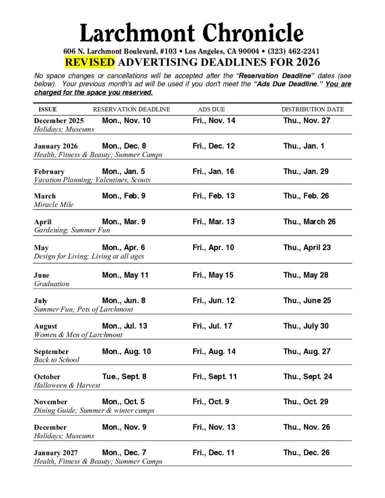 Director of Marketing, Jesse Wilson, 323-462-2241, ext. 11, jesse@larchmontchronicle.com