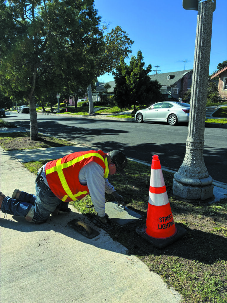 BUREAU OF STREET Lighting’s Angel Once seals a junction box on Ridgewood Place, making access to the junction box extremely difficult for thieves.
