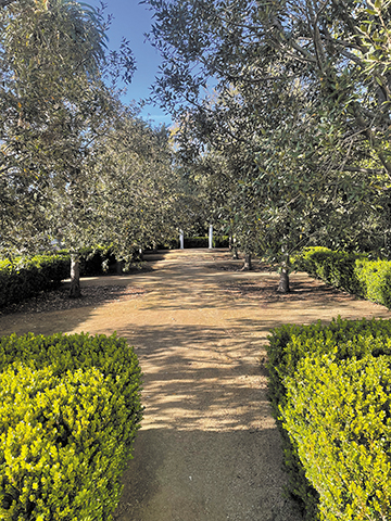 A regal oak-lined front yard pathway and a staggering variety of greenery will greet visitors to Leah and Sam Fischer’s Georgian-style home in Windsor Square. Landscape designer Patricia Brenner divided the property into distinct outside rooms, including a fire pit area and kitchen room with citrus trees, 100-year-old sycamores and wisteria-laden pergolas. A historic pet cemetery from the 1920s is an interesting garden feature.