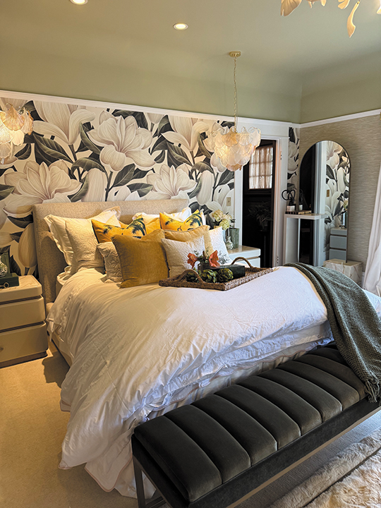 ONE OF THE home’s several redesigned bedrooms, called the Magnolia Room, oozes luxury and comfort. Designed by Steven Cordrey of Cordrey Collection.