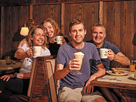 SEATED IN MAX AND HELEN’S are (from left) Monica Horan, Lily Rosenthal, Ben Rosenthal, and Phil Rosenthal.