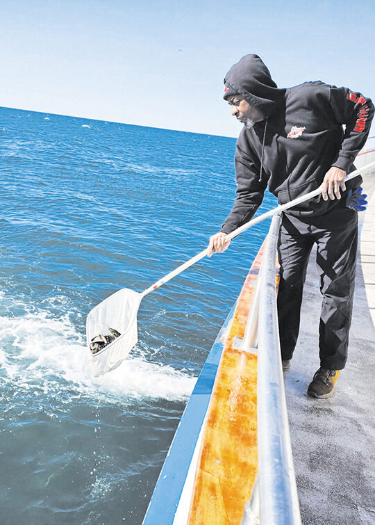 “The fish arrive to us in October at about three inches long. My jobs include feeding them and doing maintenance on the pens. As volunteers we also do a good deal of recording growth, water temperature, and deaths of any fish who are finally chipped for research. Release day was early this year, March 5, because of their unusually fast growth in 2026. They were crowded into a pen and transferred to a bait tank on the sports fishing boat, the Betty O (which is over 100 years old and happens to be the same boat we will fish from later!). We successfully sent out 1,458 white seabass. That night, at the dock, we released more from the containment gates without predation as we shielded them from hungry sea lions. They swam out to populate the Pacific.”