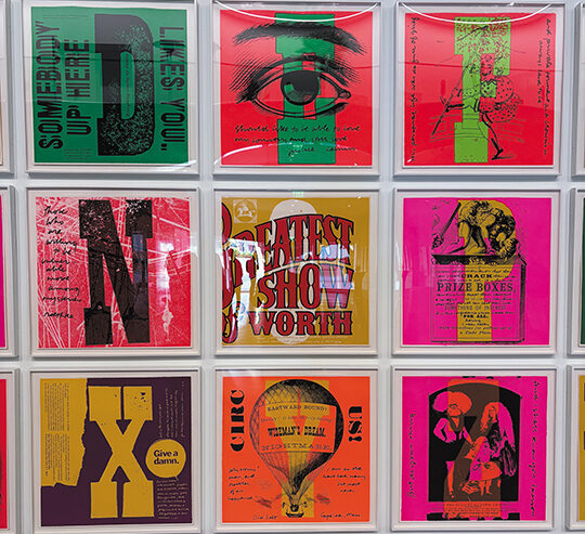 CIRCUS ALPHABET posters (partial view) by Sister Corita Kent introduce visitors to the artist, 1968.