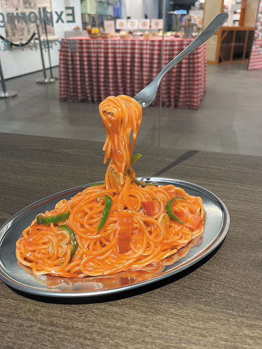 JAPAN HOUSE FOOD REPLICA of spaghetti with floating fork.